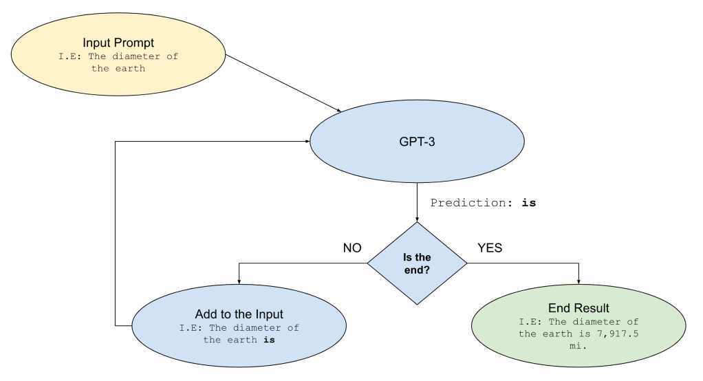 The previous illustration shows the process for a simple sentence. To clarify further how it works, I will explain how GPT-3 can predict the simple sentence “The diameter of the earth is 7,917.5 mi.” from the input “The diameter of the earth.”
