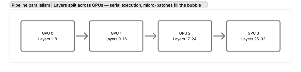 Note: Kubernetes can schedule GPUs (and you can request multiple GPUs per pod), but model parallelism typically runs during inference. In practice, you usually implement these strategies by using a serving/runtime framework that implements the sharding and collective communication logic (e.g., vLLM, DeepSpeed Inference, or TensorRT-LLM).