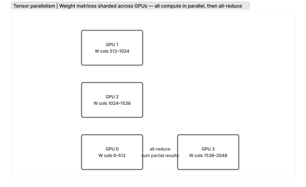 Shard large matrix multiplications (e.g., attention/MLP weights) across GPUs so each device holds only a slice of the tensors; combine results via collectives.